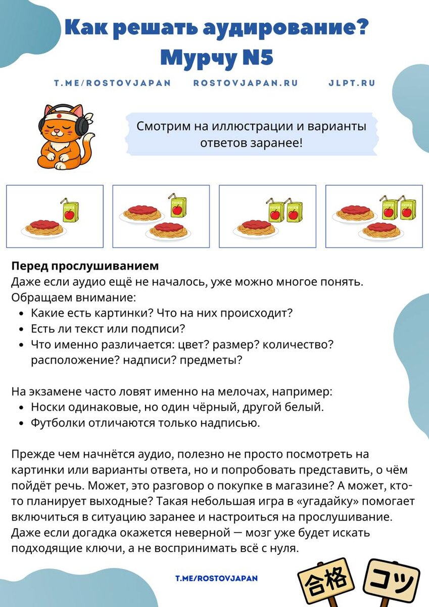 ⚡️Сегодня — последний день записи на интенсивы Мурчу N4 и Мурчу N5⚡️ Если ты: 😟 чувствуешь неуверенность в своих знаниях ⏳ боишься, что не успеешь повторить всё важное 🎧 не знаешь, как справляться с аудированием 💫 хочешь разобраться в частицах, условных формах или чтении кандзи... 🤝 мечтаешь о возможности получать обратную связь и ответы на свои вопросы Мы будем рядом. До самого экзамена. Внутри закрытых каналов тебя ждут: ✅ Обратная связь — на любые вопросы, тесты, задания 💡 Разборы типовых ловушек — на которых валят на экзамене 📄 Настоящие задачи из прошлых лет 📚 Обобщение грамматики и чтение в формате JLPT 🎧 Аудирование — на что обращать внимание, как «слышать ответ» 🧩 Много практики — по частям, не залпом 🤝 Мотивация, поддержка и мягкий пинок, когда нужно 🔎 Уже сейчас на каналах доступны обзоры всех типов заданий, которые появляются на JLPT: Лексика: чтение кандзи, написание слов, синонимы, употребление слов в контексте Грамматика и чтение: от частиц до работы с текс