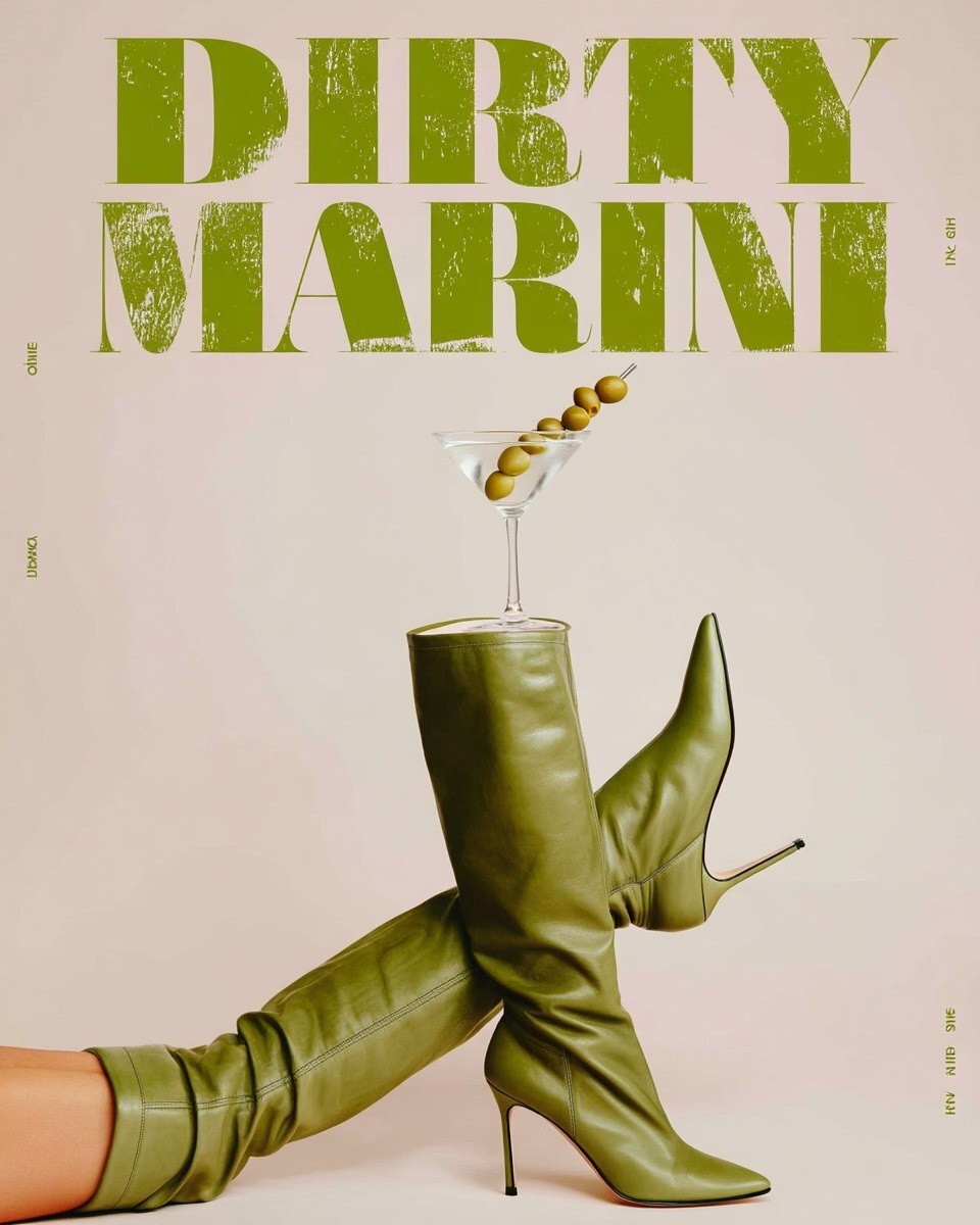Создано на основе запроса: A stylish and surreal fashion editorial scene featuring a pair of elegant olive green high-heeled leather boots worn by a model with legs raised vertically against a minimalist off-white background. Balanced perfectly on the sole of one boot is a classic martini glass filled with a dirty martini, garnished with three green olives on a cocktail pick. Bold text at the top reads "DIRTY MARTINI" in large, textured, olive green capital letters. Additional text describes the cocktail recipe. The overall aesthetic is modern, bold, and high fashion with a playful twist