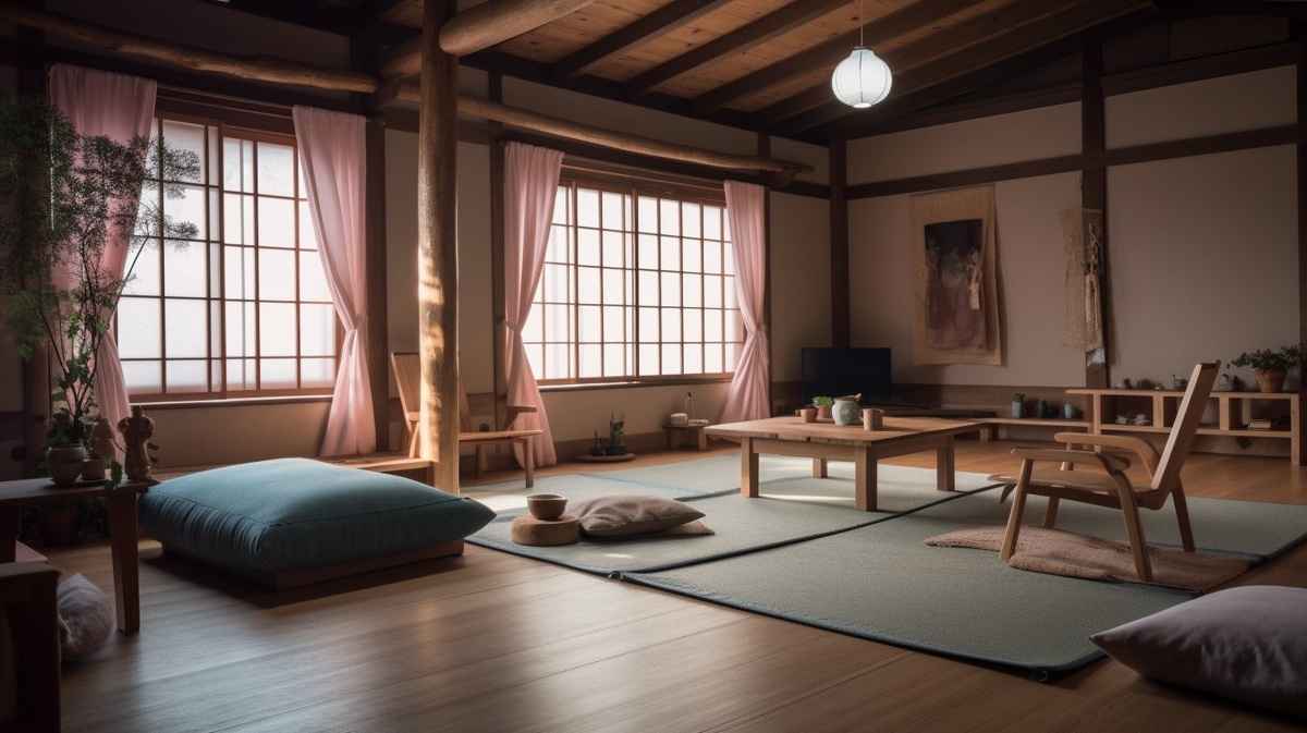Создано на основе запроса: interior of a traditional Japanese farmhouse (kominka), warm wooden beams, tatami mats, and shoji screens, softly lit by natural daylight. Add pastel-colored accent items only: mint green cushions, soft pink curtains, baby blue vase, pale yellow flowers in a ceramic pot. Cozy and minimalist styling, no large modern furniture, balanced composition, cinematic lighting, high detail