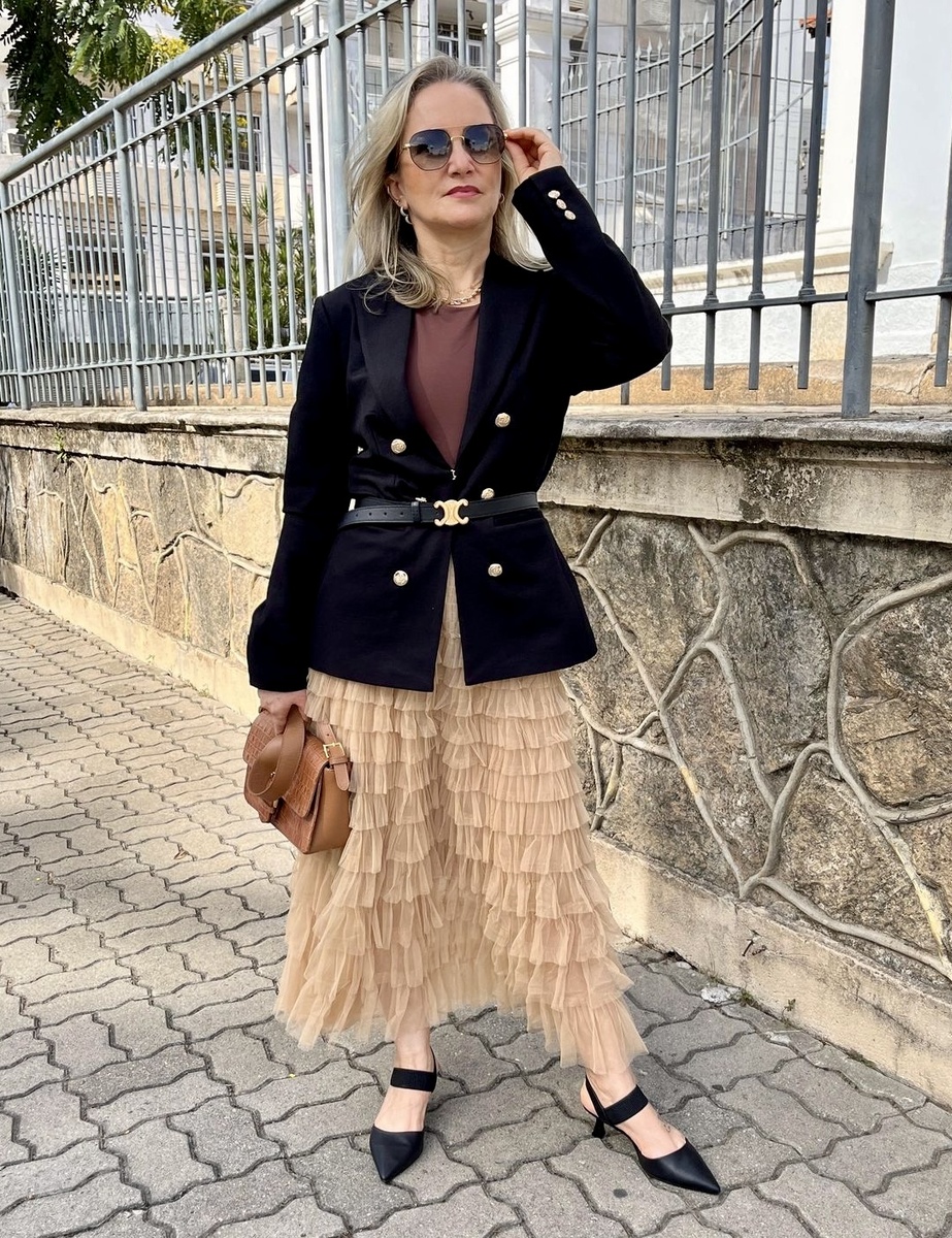 Если утром у вас деловые встречи, а вечером — свидание или вечеринка с подругами, ярусная юбка станет идеальным компромиссом. Её фактурный силуэт сам по себе делает лук более стильным, так что можно обойтись без сложной укладки и высоких каблуков.