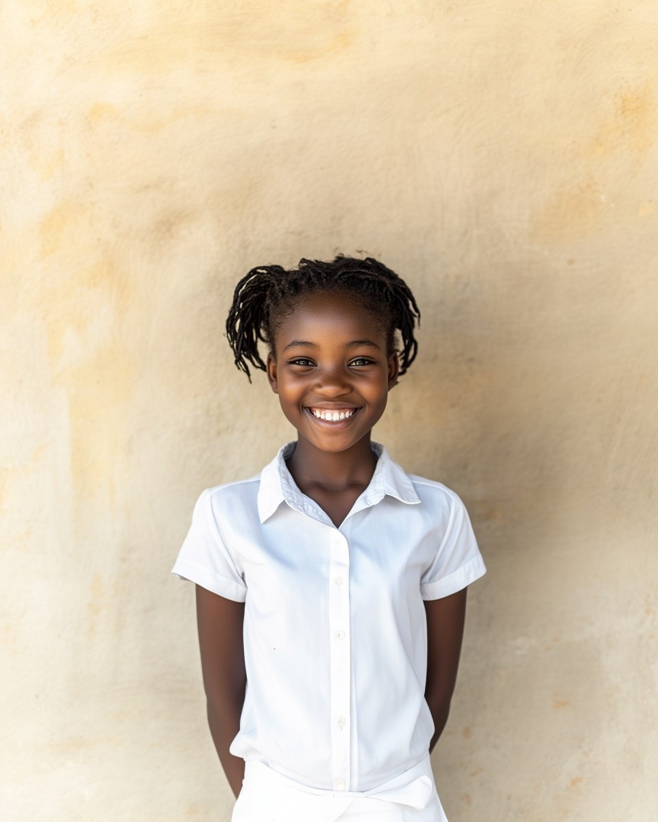 Создано на основе запроса: Low-angle portrait of a clean, well-groomed African female youth, fresh out of secondary school, wearing smart
