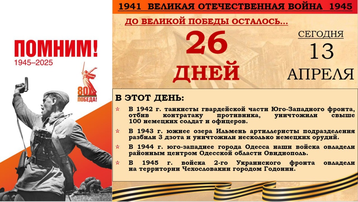 В 1392 день войны, 13 апреля 1945 года в Чехословакии освобожден город Годонин. От противника полностью очищена столица Австрии — Вена.