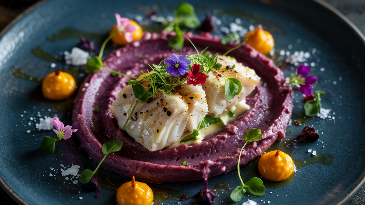 Филе рыбы в карамельной глазури, пюре из фиолетового картофеля, цитрусовый гель и чёрная соль Смешай мёд и соевый соус. Замаринуй рыбу на 20-30 мин.