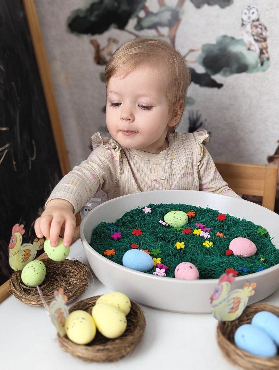 Всыпьте крашеную вермишель в виде травы в большую ёмкость, сверху выложите разноцветные декоративные яйца. В каждое гнездо положите по одному яичку разных цветов для образца, по какому принципу раскладывать яйца. Нарисуйте курочек и прикрепите их к гнездышкам. Гнезда можно сделать из маленьких коробочек или тарелочек, застеленных мятой бумагой для выпечки. Для детей, которые знакомы с цифрами, можно добавить обозначения, сколько яичек положить в каждое гнездо.🌼