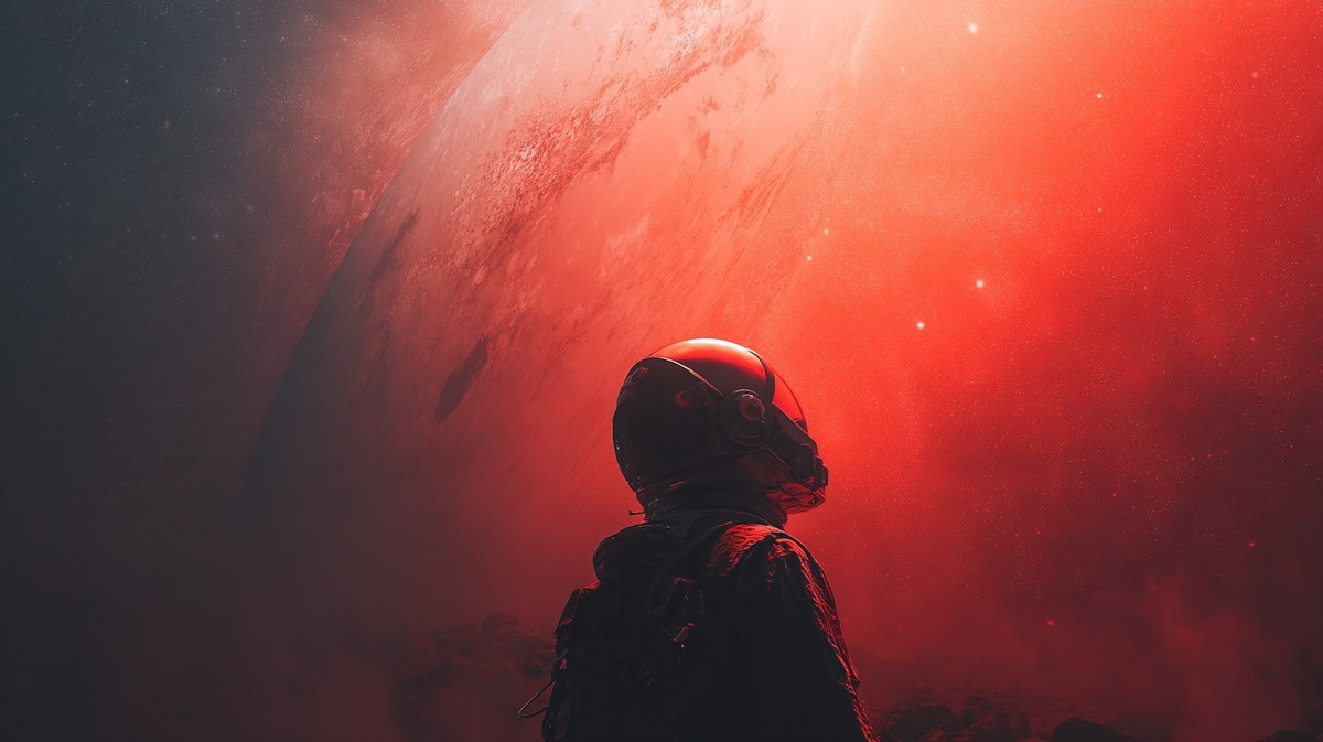 Создано на основе запроса: Wide-angle photo of a cybernetic mercenary on a red planet, looking up, in the center of the composition