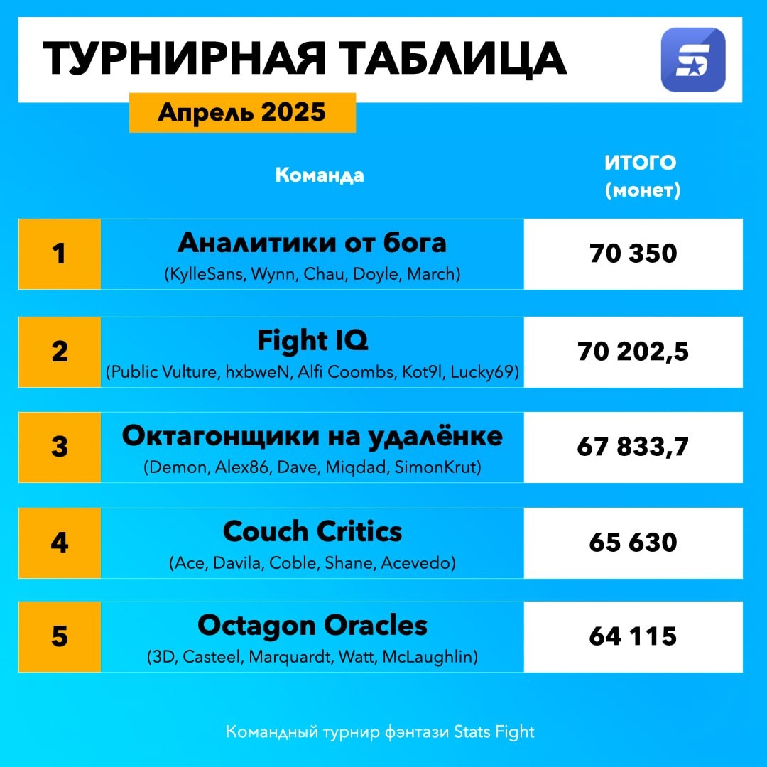 🏆 Первая турнирная таблица командного зачета фэнтази Stats Fight: 🥇 Аналитики от бога - 70 350 монет 🥈 Fight IQ - 70 202 монет 🥉Октагонщики на удалёнке - 67 833,7 монет 🔽 Состав команд и их результаты: см. в комментариях. Особенно обратите внимание те, кто подавал заявки, но пока редко участвует в самих ивентах. 🙏🏻 Огромное спасибо всем, тем кто активно участвует! Регистрация продолжается — присоединяйтесь и соревнуйтесь в лиге аналитиков UFC и ММА. 🛠 Турнир сейчас находится в стадии тестирования — мы отрабатываем процессы, чтобы в будущем реализовать полноценные командные соревнования прямо в приложении. Будем признательны за любую обратную связь!
