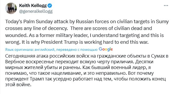Посланник Трампа по вопросам Украины и РФ Келлог: «Сегодняшняя атака России на гражданские объекты в Сумах в Вербное воскресенье пересекает любую грань приличия, и это неправильно». Заря | Новости - Подписаться