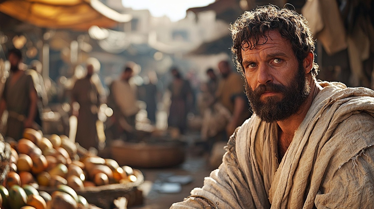 Создано на основе запроса: ancient Greek marketplace scene, workers and merchants actively working and trading, in the background a man
