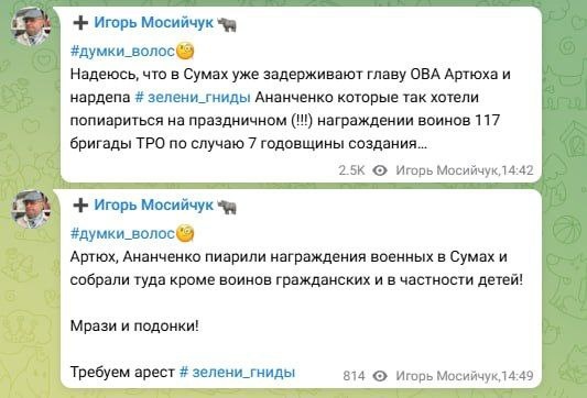 "Надеюсь, что в Сумах уже задерживают главу ОВА Артюха и нардепа Ананченко, которые так хотели попиариться на праздничном награждении воинов 117 бригады ТРО по случаю 7 годовщины. Мрази и подонки!" – заявил Мосийчук