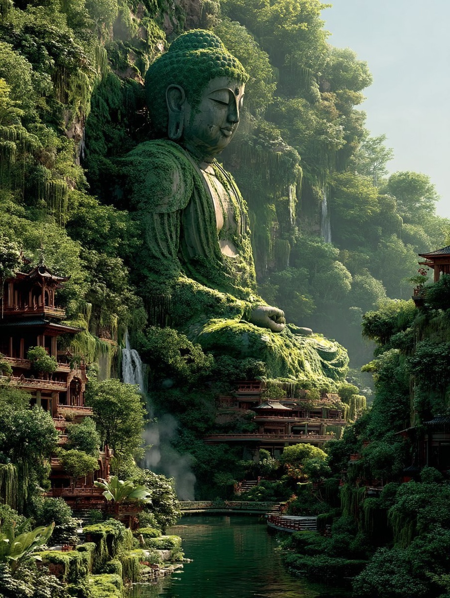 Создано на основе запроса: Buddha statue in the jungle with waterfalls and pagoda, lush jungle background, beautiful nature, greenery, nature photography, waterfall. Nibiru --- Автоперевод: Статуя Будды в джунглях с водопадами и пагодой, пышным фоном джунглей, красивой природой, зелени, фотографии природы, водопадом. Как тебе это изображение? 🤔 https://dzen.ru/id/65c0c65c86e4f837c27b24d7 #ИИ #AI #нейросеть #midjourney #art