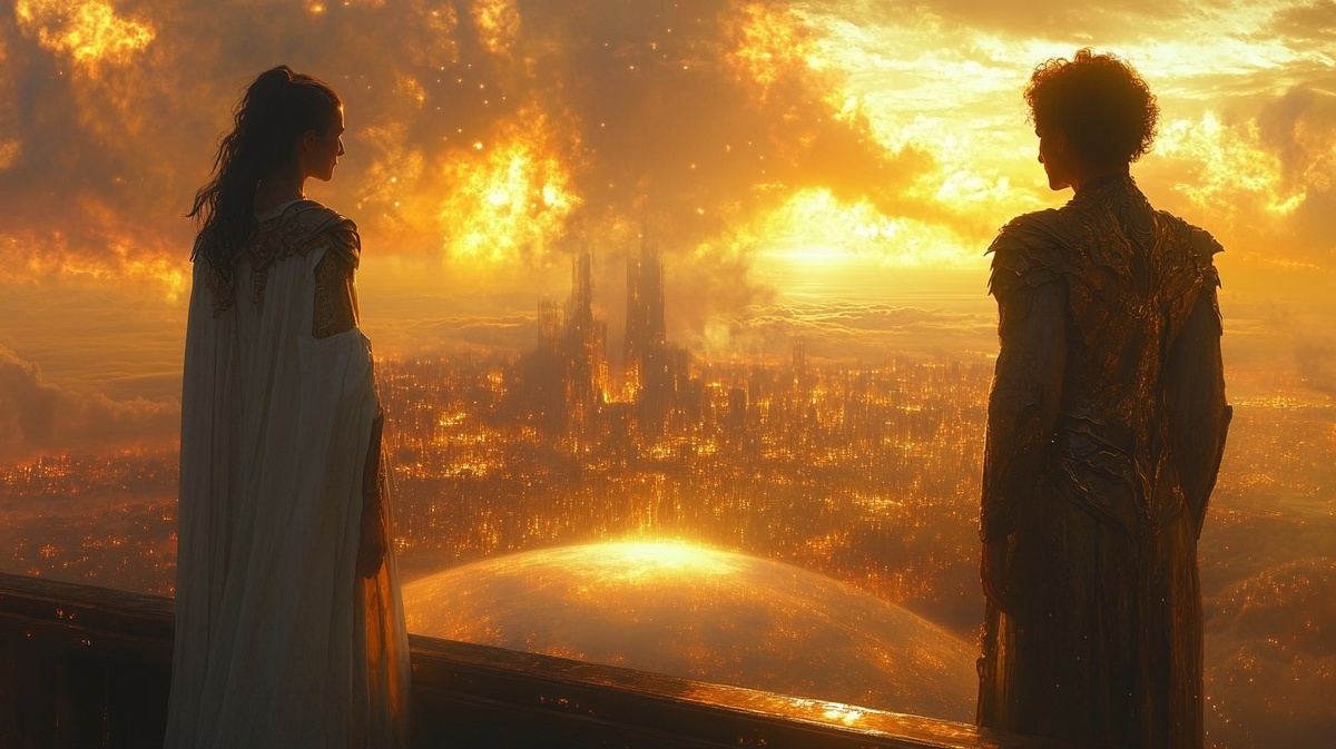 Создано на основе запроса: Michael and Azazel stand together on a high heavenly balcony, overlooking a softly glowing Earth below. Michael looks composed, while Azazel’s face shows curiosity and inner conflict. The space around them is lit with gentle rays of divine gold and faded ochre, suggesting peace before the fall.