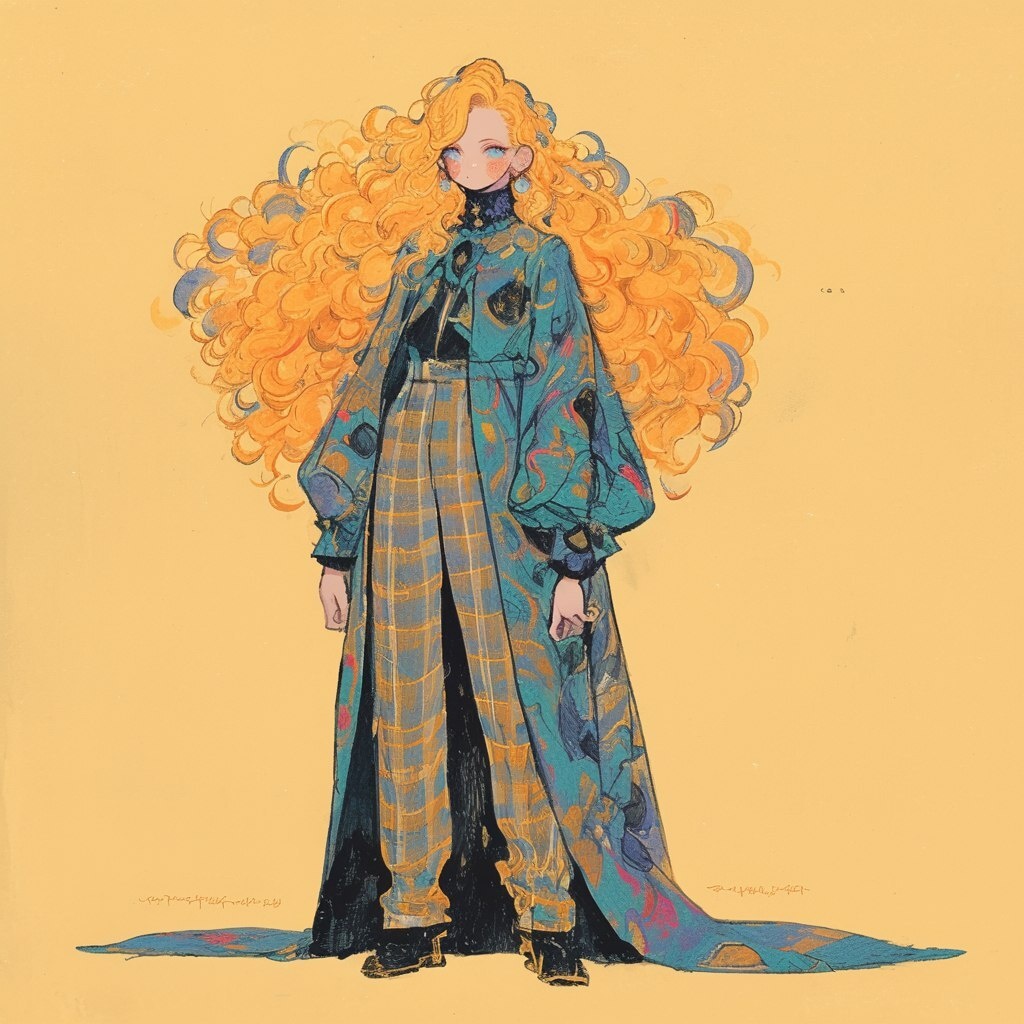 Создано на основе запроса: A full-length girl in a beautiful patterned suit, fluorescent orange hair and pale blue eyes