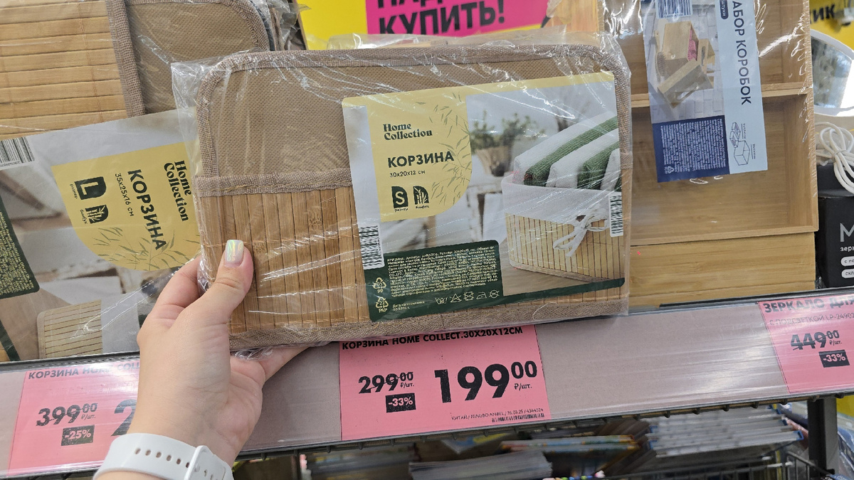 Вот такие корзинки теперь по 199 рублей. Они сделаны из бамбука, с хлопковой вставкой внутри. Китай. Размер 30*20*12 см.