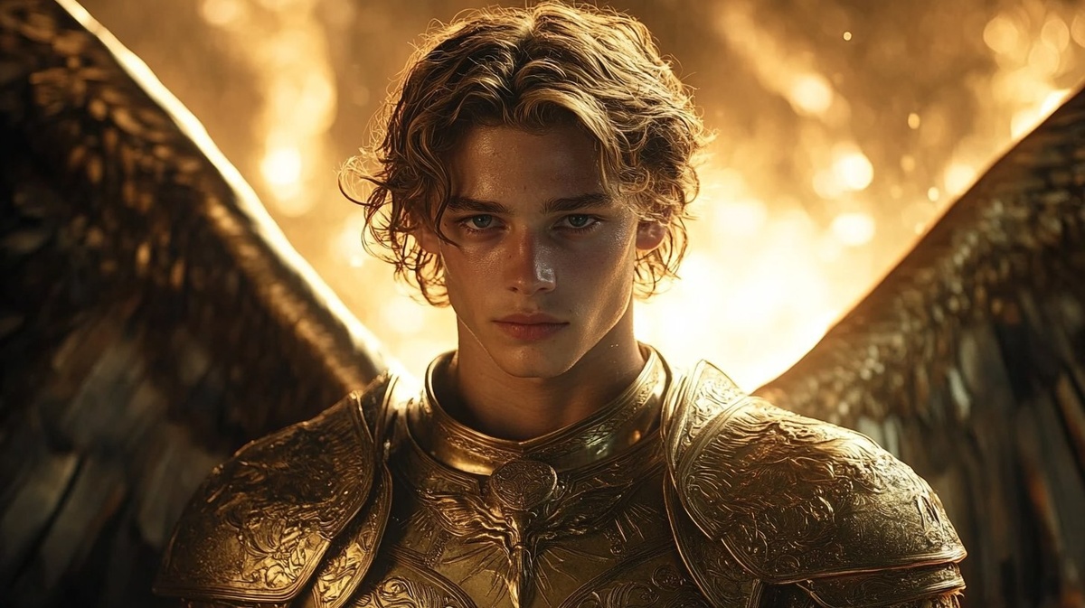Создано на основе запроса: Michael stands confidently beneath a glowing divine Throne, wearing golden armor with intricate celestial engravings. His youthful face is focused and brave, with his sword resting lightly at his side. His wings are semi-folded, glowing faintly with soft amber tones, as divine light from above casts a sacred glow around him. --- Автоперевод: Майкл уверенно стоит под светящимся божественным троном, нося золотой доспехи со сложными небесными гравюрами. Как тебе такой вариант? 🤔 https://dzen.ru/id/65c0c65c86e4f837c27b24d7 #ИИ #AI #нейросеть #midjourney #art