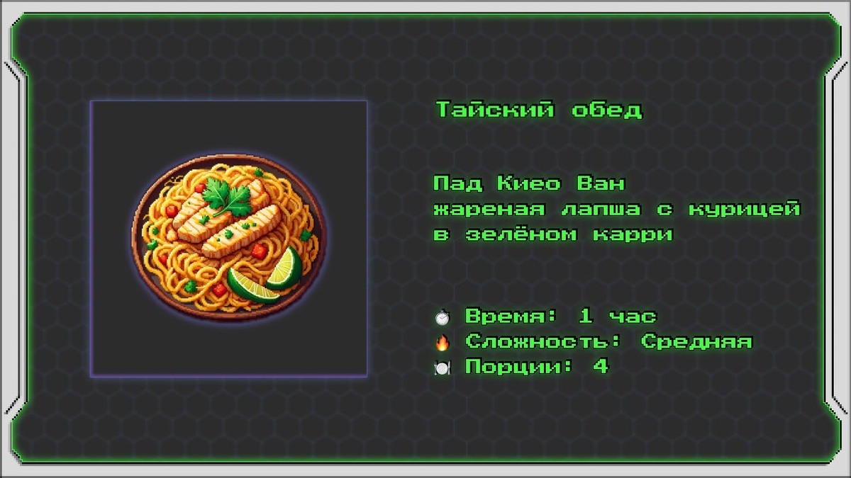 Тайский обед Пад Киео Ван (жареная лапша с курицей в зелёном карри) Этот рецепт представляет собой классическое тайское блюдо — зелёную лапшу в кокосовом соусе с курицей. Это ароматное и насыщенное блюдо идеально подходит для сытного обеда и отражает богатство тайской кухни. Информация о рецепте: ⏱️ Время: 1 час 🔥 Сложность: Средняя 🍽 Порции: 4 Ингредиенты: Для лапши: • 🍜 Рисовая лапша (сухая) — 200 г Для соуса: • 🥥 Кокосовое молоко — 400 мл • 🍅 Помидоры (мелко нарезанные) — 200 г • 🌶 Зелёная паста карри — 2 столовые ложки • 🌿 Листья каффир-лайма — 3 штуки • 🌿 Лемонграсс (мелко нарезанный) — 1 стебель • 🍋 Сок лайма — 2 столовые ложки • 🍯 Мёд или пальмовый сахар — 1 столовая ложка • 🧂 Соль — по вкусу Для курицы: • 🥩 Куриное филе (нарезанное полосками) — 300 г • 🫒 Оливковое масло — 1 столовая ложка Для подачи: • 🌿 Кориандр свежий — для украшения • 🌶 Дольки лайма — для подачи Приготовление: Шаг 1: Подготовка ингредиентов 1. Замочите рисовую лапшу в тёплой во