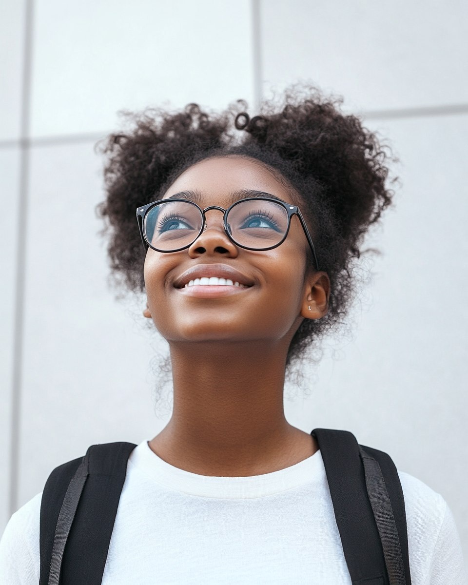 Создано на основе запроса: Low-angle portrait of a clean, well-groomed African female youth, fresh out of secondary school, wearing smart casual attire, bright smile or optimistic expression, standing tall with a sense of achievement, against a simple, modern background, youthful, fresh energy, minimalistic style