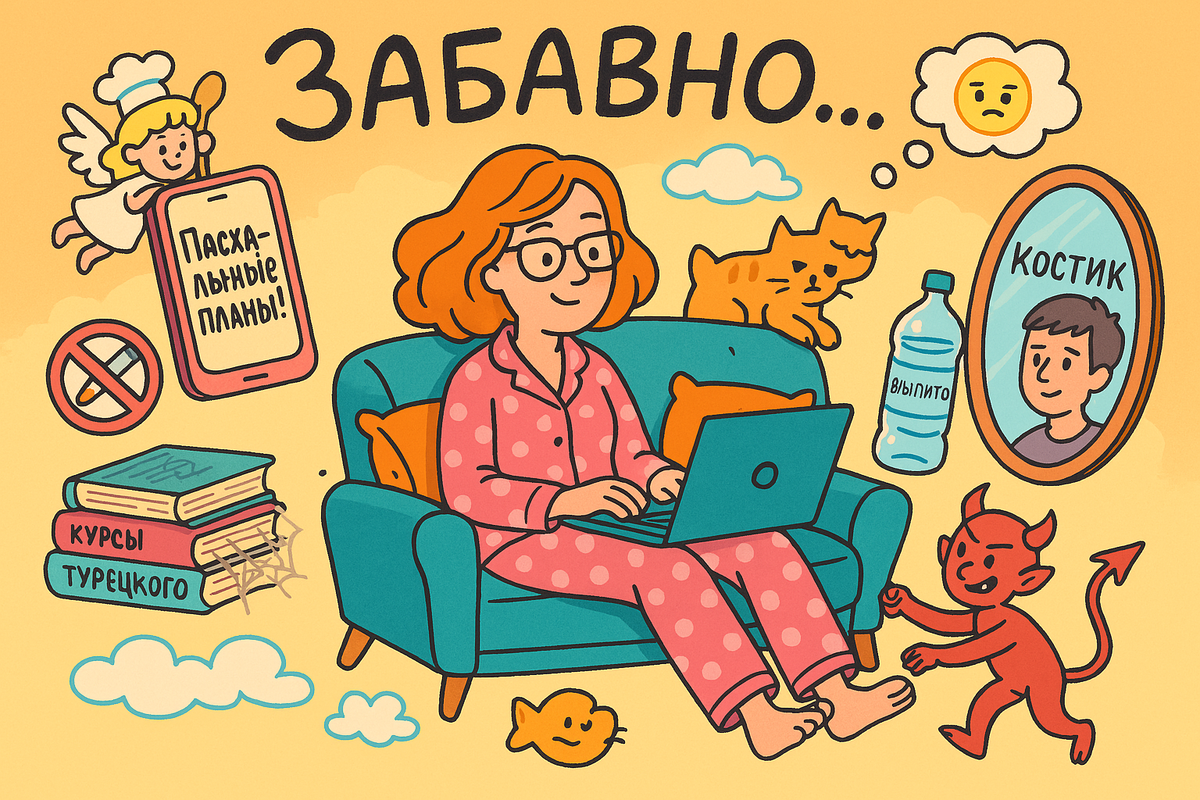 Пока я корпела над своими текстами, позвонила местная подруга — обсуждали Пасху, планы, готовку. И — о чудо! — сразу появилась энергия, будто кто-то нажал кнопку «старт». Движ, подготовка, предвкушение — вот оно, ощущение жизни! А потом объявился Костик — мое зеркальное отражение (но о нём отдельный роман напишу, это большая тема). И я, конечно же, тут же отложила всё и включилась в разбор его проблем. Да ещё и едва удержалась от соблазна высказать, «почему у него всё так…» Как же легко, правда, разглядывать соринки в чужих глазах, когда своё бревно аккуратно игнорируешь! Я мастер переключения внимания на «важные» дела, которые на поверку оказываются... ну, не то чтобы совсем важными. Вот, например: Знаю себя: если действительно хочу что-то сделать — меня не остановит даже землетрясение. А тут... мозг вроде понимает, что обучение необходимо, но что-то мешает. Что-то — это, конечно же, я сама. Ждать, когда захочется? Или просто начать и внедрять это как привычку? С водой у меня получает