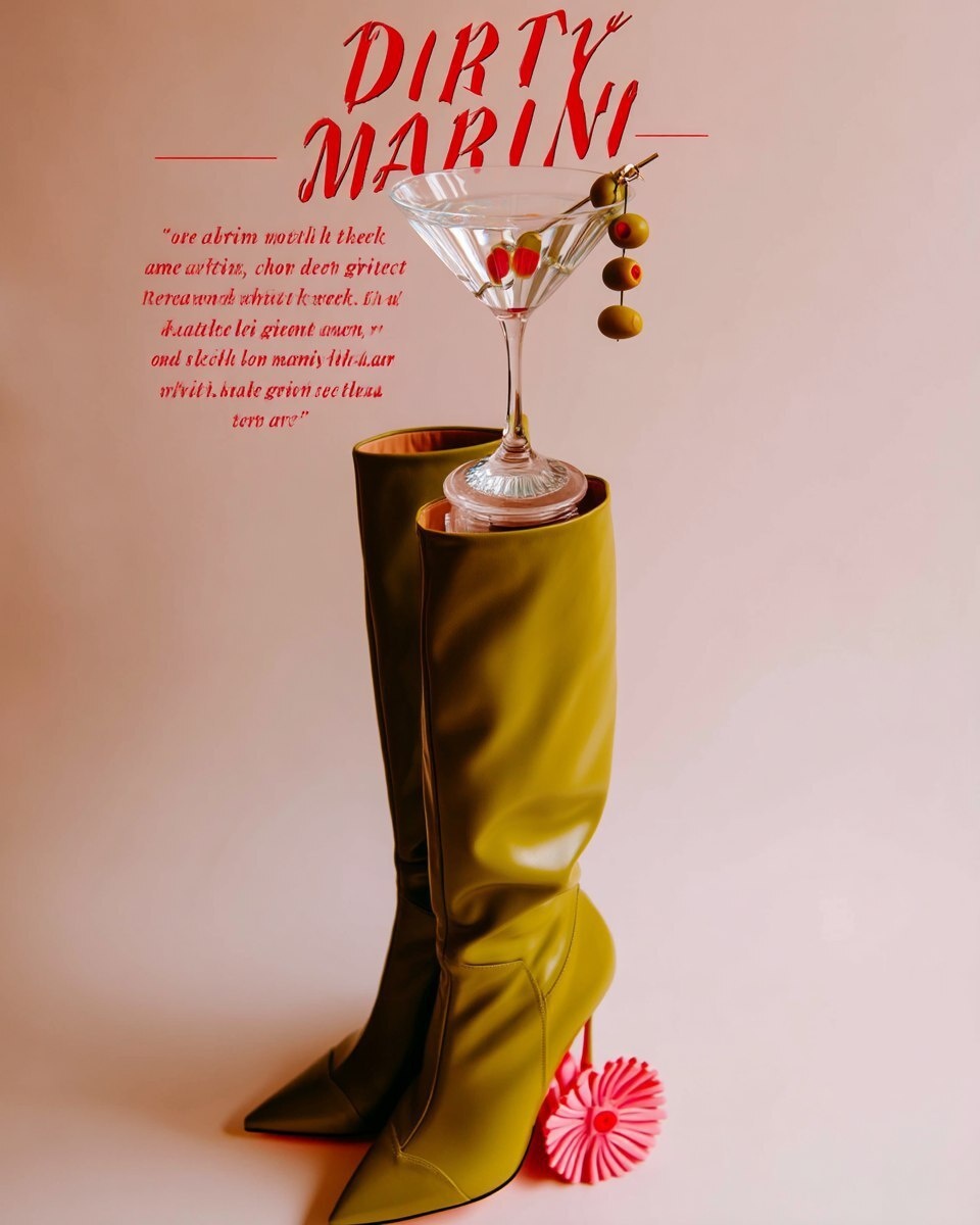 Создано на основе запроса: A stylish and surreal fashion editorial scene featuring a pair of elegant olive green high-heeled leather boots worn by a model with legs raised vertically against a minimalist off-white background. Balanced perfectly on the sole of one boot is a classic martini glass filled with a dirty martini, garnished with three green olives on a cocktail pick. Bold text at the top reads "DIRTY MARTINI" in large, textured, olive green capital letters. Additional text describes the cocktail recipe. The overall aesthetic is modern, bold, and high fashion with a playful twist