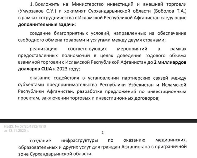 20 ноября 2020 года Президент Республики Узбекистан подписал Указ № ПП-4892 «О мерах по дальнейшему расширению и укреплению экономического сотрудничества с Исламской Республикой Афганистан, где предписано: