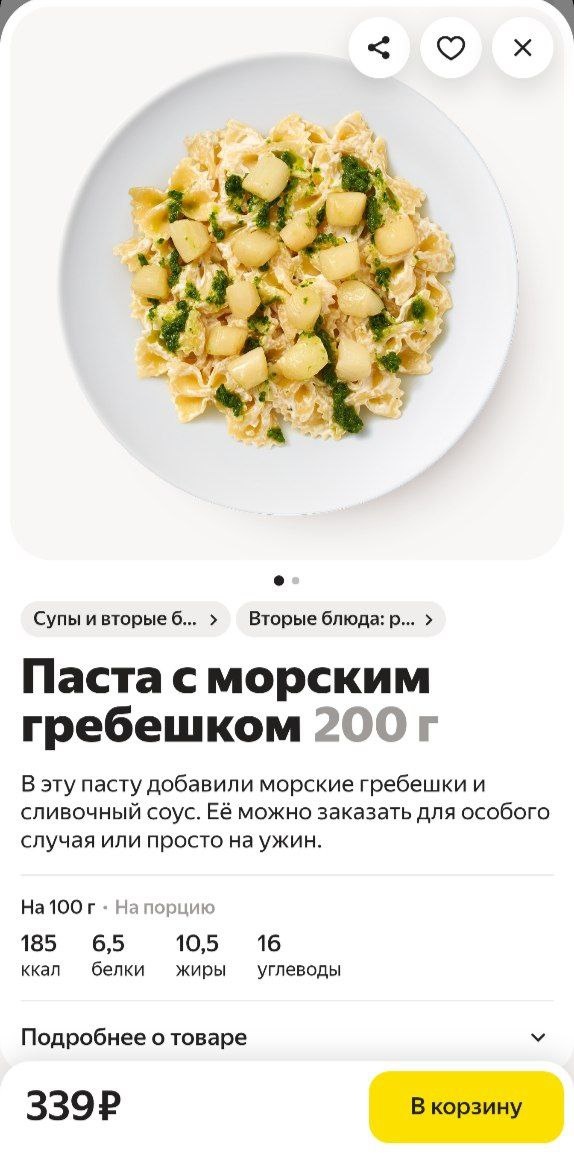 Какая-то тотальная имба появилась в Лавке. Правильно сваренные фарфалле, нежный сливочный соус, освежающая зелень петрушки. Самое главное - гребешка не пожалели - размер небольшой, но по количеству всё честно, штук 8-10 попадается. А главное цена - где ещё за 339 р. съешь фактически ресторанное блюдо.
