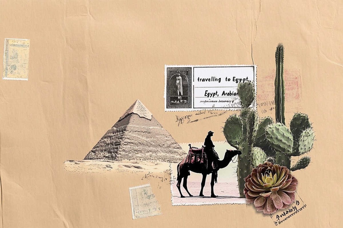 Создано на основе запроса: A minimalistic collage with the theme of "travelling to Egypt," featuring cacti, camels, and pyramids. The background is light brown paper, and between these elements, there's an old stamp that says "Arabian journey" and postmarks from around the Egyptian desert landscape. A simple design, with a feminine style, happy vibes, and natural colors.