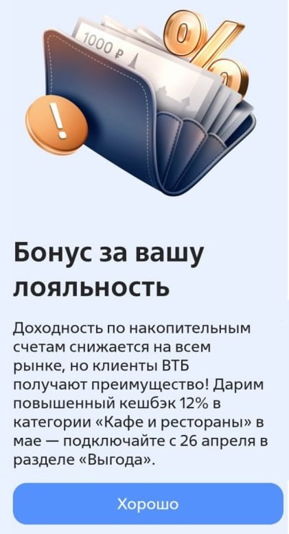 Я уже писала в тг-канале о том, что ВТБ с 15 апреля уменьшает ставки по накопительным счетам. Теперь счет на минимальный остаток и счет на ежедневный остаток сравнялись и будет 19%, даже тем, у кого уже открыт счет. В качестве извинения ВТБ предлагает клиентам (некоторым) повышенный кешбэк на следующий месяц в категории "Кафе и рестораны" кому-то дает 12%, кому-то 10%, проверяйте у себя, если у вас открыт накопительный счет. А теперь пришла новость о том, что с 14 апреля ВТБ ухудшает условия подписки ВТБ-плюс. Подписка «ВТБ Плюс» была запущена на массовую аудиторию в сентябре 2024 со стоимостью 249 ₽/мес, первые 30 дней бесплатно. Эконом-вариант был запущен позднее: для участников акции «Мои Близкие» (Профиль > Близкие) доступно подключение подписки на 60 дней бесплатно, затем — 199 ₽/мес. Подписка недоступна для Привилегии и Прайма. С 14.04.25 вводятся новые тарифы, по которым с 1 мая стоимость вырастет: - 349 ₽/мес вместо 249₽/мес - 299 ₽/мес по спец. предложению, возможно это для