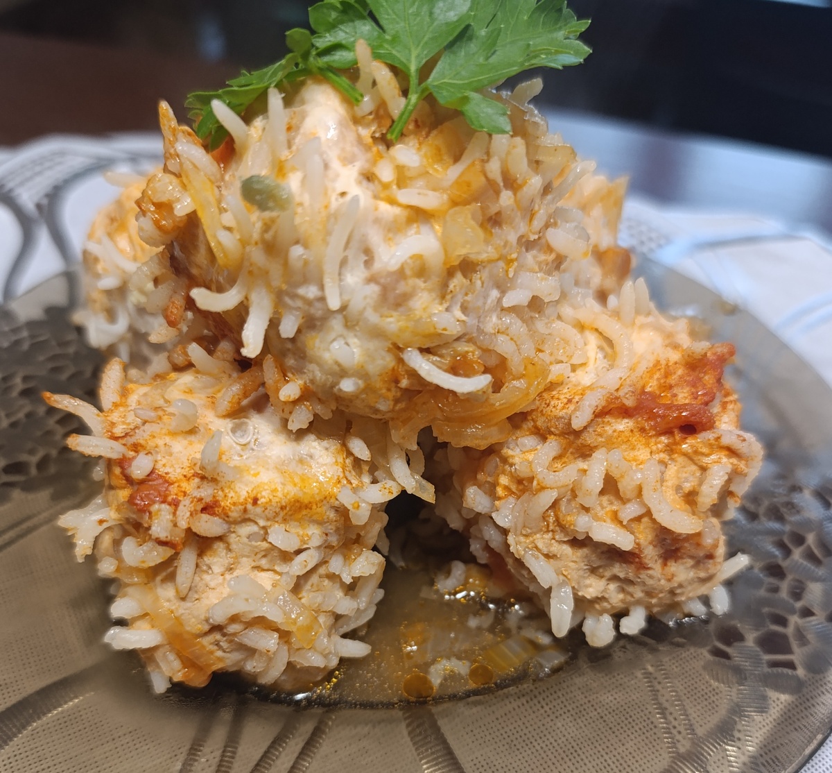 Пока лук обжаривается, готовим полуфабрикаты для ежиков. В фарш добавляем рис, паприку, 1 ч л соли, 3 измельченных зубчика чеснока. Перемешиваем.