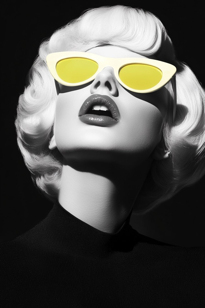 Создано на основе запроса: Lady Gaga in black and white, only her neon-colored sunglasses, eccentric and bold, modern street portrait, high