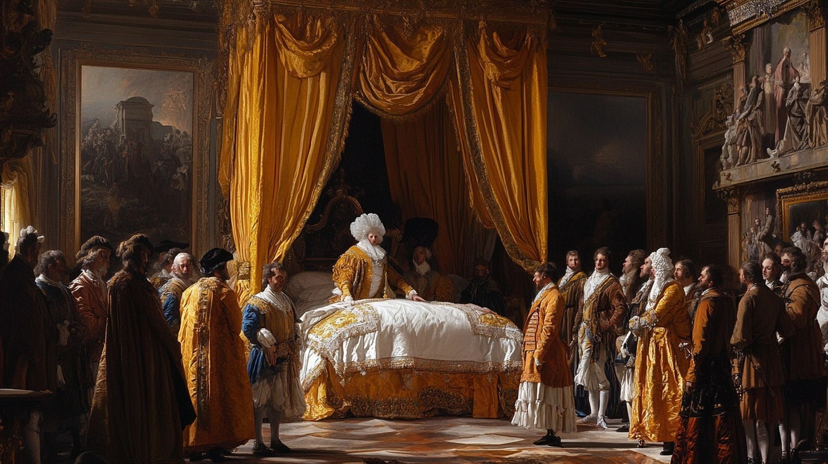 Создано на основе запроса: Louis XIV waking up in an extravagant royal bed surrounded by noblemen watching in awe, golden curtains parting