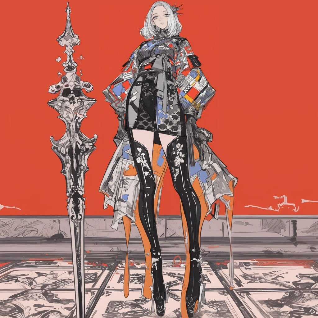 Создано на основе запроса: Full-length girl in a beautiful patterned suit, cold gray hair and gray eyes
