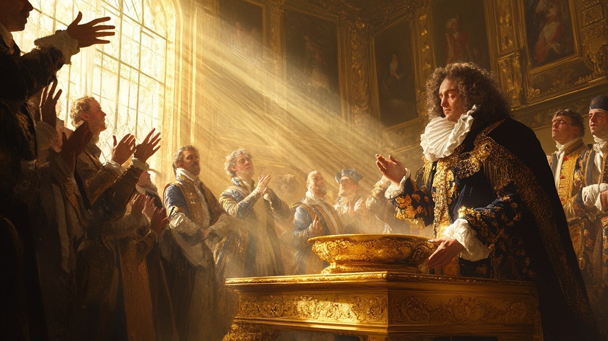 Создано на основе запроса: a dramatic and slightly surreal baroque-style digital painting of King Louis XIV gently washing his face in a golden basin, while a group of noblemen in elaborate 17th-century attire stand behind him with hands over their hearts, some in tears, others clapping or looking in awe, sun rays pouring through palace windows, theatrical lighting, absurd reverence, Versailles palace interior --- Автоперевод: Драматическая и слегка сюрреалистическая цифровая живопись в стиле барокко короля Людовика XIV, мягко стирающего его лицо в золотом бассейне, в то время как группа дворян в тщательно продуманных нарядах 17-го века стоит позади него руками над их сердца Неплохо получилось? 🤔 https://dzen.ru/id/65c0c65c86e4f837c27b24d7 #ИИ #AI #нейросеть #midjourney #art