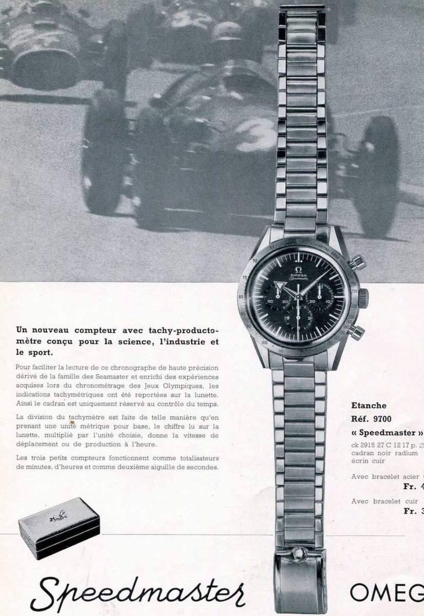 Итак, для начала – немного истории для тех, кто не в курсе. В далёком 1957 году швейцарская часовая фирма Omega выпустила свой первый гоночный хронограф под названием Speedmaster. Модель представляла собой спортивный гоночный хронограф, способный фиксировать отрезки времени длительностью до 12 часов. Часы оснащались механическим калибром Omega321 с ручным заводом. За широкие стрелки с острыми наконечниками модель получила прозвище «Broad Arrow». Также её отличительной особенностью стала тахиметрическая шкала, впервые размещенная на внешнем безеле.