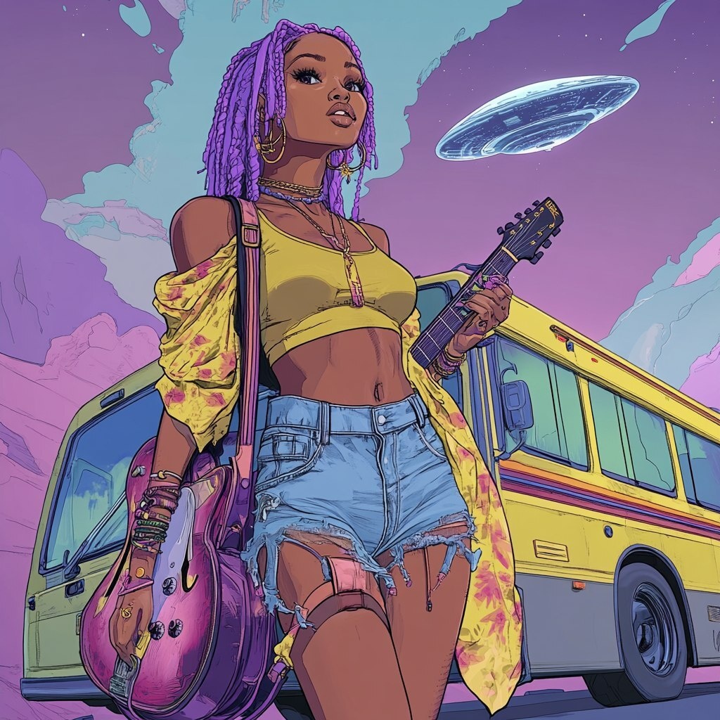 Создано на основе запроса: a 21 year old light skinned African-American woman wearing cutoff jean shorts and a canary yellow top, waits outside a bus top. She is carrying a guitar in a case. She had lavendar color hair in boho braids. There is a UFO in the sky behind her. ar 1:1