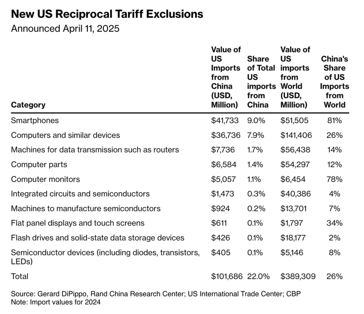 💵 Трамп освободил от тарифов ряд технологических товаров, в том числе компьютеры, смартфоны, полупроводники, солнечные панели, дисплеи и накопители для хранения данных. Тарифные льготы распространяются на ~390 млрд импорта США.