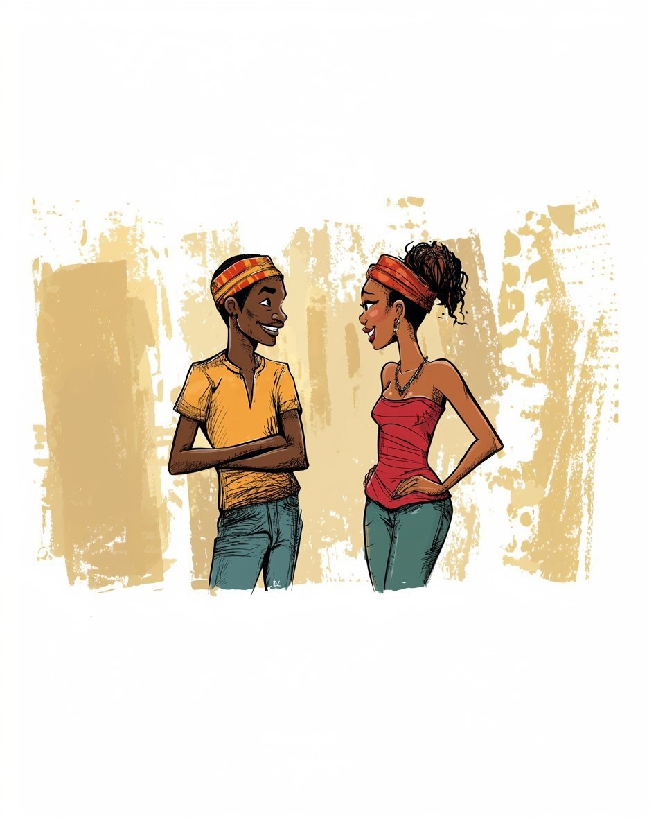 Создано на основе запроса: Comic-style illustration of two African individuals engaged in a friendly conversation, expressive facial features, vibrant colors, cartoonish but detailed, simple background, showcasing natural body language and relaxed posture, contemporary fashion, lighthearted tone