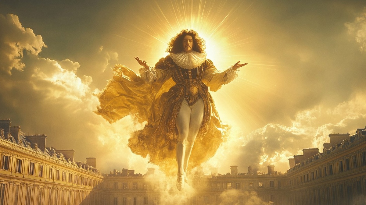 Создано на основе запроса: symbolic image of Louis XIV glowing like a sun god, floating above Versailles palace with sun rays behind him