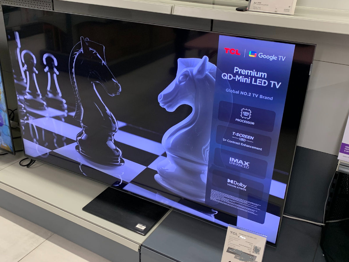 Сегодня мы поближе познакомимся с телевизором 55 диагонали от китайского производителя TCL. Подробнее познакомимся с его возможностями и в заключении сделаем выводы. Телевизор выполнен в безрамочном корпусе черного цвета, а за устойчивость панели отвечает центральная ножка, которая смотрится вполне эстетично. Также имеется возможность настенного крепления по типу VESA 300 x 300, которое нужно докупать отдельно. Телевизор оснащен следующими типами разъемов: Обновленный пульт управления от TCL представляет из себя довольно удобное устройство, которое хорошо лежит в руке, имеет кнопку голосового ассистента и работает по Bluetooth соединению. Цифровой блок отсутствует. Телевизор получил Mini LED подсветку и HVA(улучшенная VA) матрицу. Имеется технология QLED. Изображение имеет достаточно глубокий черный цвет и высокую контрастность. Однако углы обзора будут небольшими из-за особенности данного типа матрицы. -Разрешение экрана: 4K UltraHD, 3840x2160 -Частота обновления экрана: 120 Гц -Подде