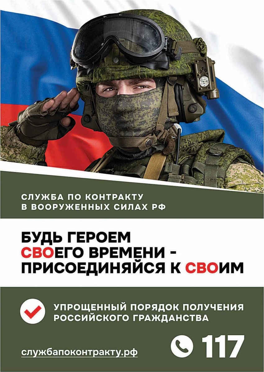 Вступай в ряды настоящих патриотов, присоединяйся к СВОим! ➡️ Чтобы поступить на военную службу по контракту, нужно обратиться в пункт отбора на военную службу (https://clck.ru/3CW3MK)или военкомат (https://clck.ru/3CW3Pp) по месту жительства. Подать заявку можно через единый портал государственных услуг (https://contract.gosuslugi.ru/) или сайт Минобороны России (https://clck.ru/3CW6TK). ❕ Подробности на сайте http://www.krskstate.ru/voen_kontrakts и по телефону 117, военкомат 8(39145)6-31-72 и пункт отбора 8-950-405-38-86.