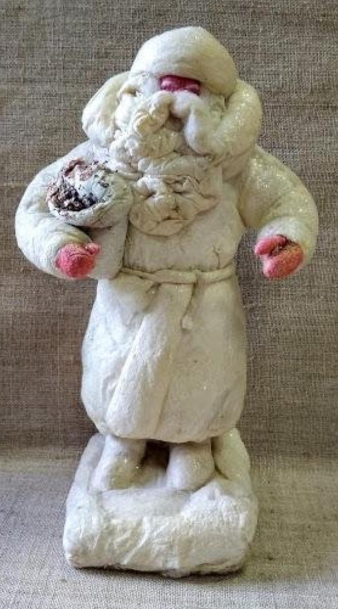 Сегодня мы познакомимся с ещё одним загадочным Дедом Морозом. Его размер составляет 23 сантиметра, и он одет в белую ватную шубу с небольшим отворотом. На фотографии не полностью видно его лицо, но я постаралась приблизить изображение, насколько это возможно. Из-под шубы видны валенки, а дедушка подпоясан ватным пояском. На руках у него красные рукавички из окрашенной ваты, а на голове — шапка из белой ваты с опушкой. В руках у него интересный мешок, который он держит под мышкой. Мешок приоткрыт, и из него выглядывают небольшие кусочки приклеенной слюды. На подставке, выполненной из массива дерева, большим слоем лежит вата, имитирующая сугроб. Размер подставки составляет 8 на 8 сантиметров, на ней виден размытый и уже нечитаемый штамп. Этот экземпляр находится в Архангельском музее. В музее есть пометка, что дата изготовления предположительно приходится на 1930-е годы. Попробуем разобраться в происхождении этого загадочного деда Мороза? Я предполагаю, что он мог быть создан либо лен