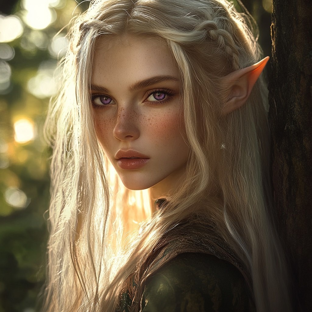 Создано на основе запроса: a female high elf with long blonde hair. she has lilac colored eyes and angular features that appear soft in the forest light she is in. she faces the camera and looks curious --- Автоперевод: Женский высокий эльф с длинными светлыми волосами. Классно вышло? 🤔 https://dzen.ru/id/65c0c65c86e4f837c27b24d7 #ИИ #AI #нейросеть #midjourney #art