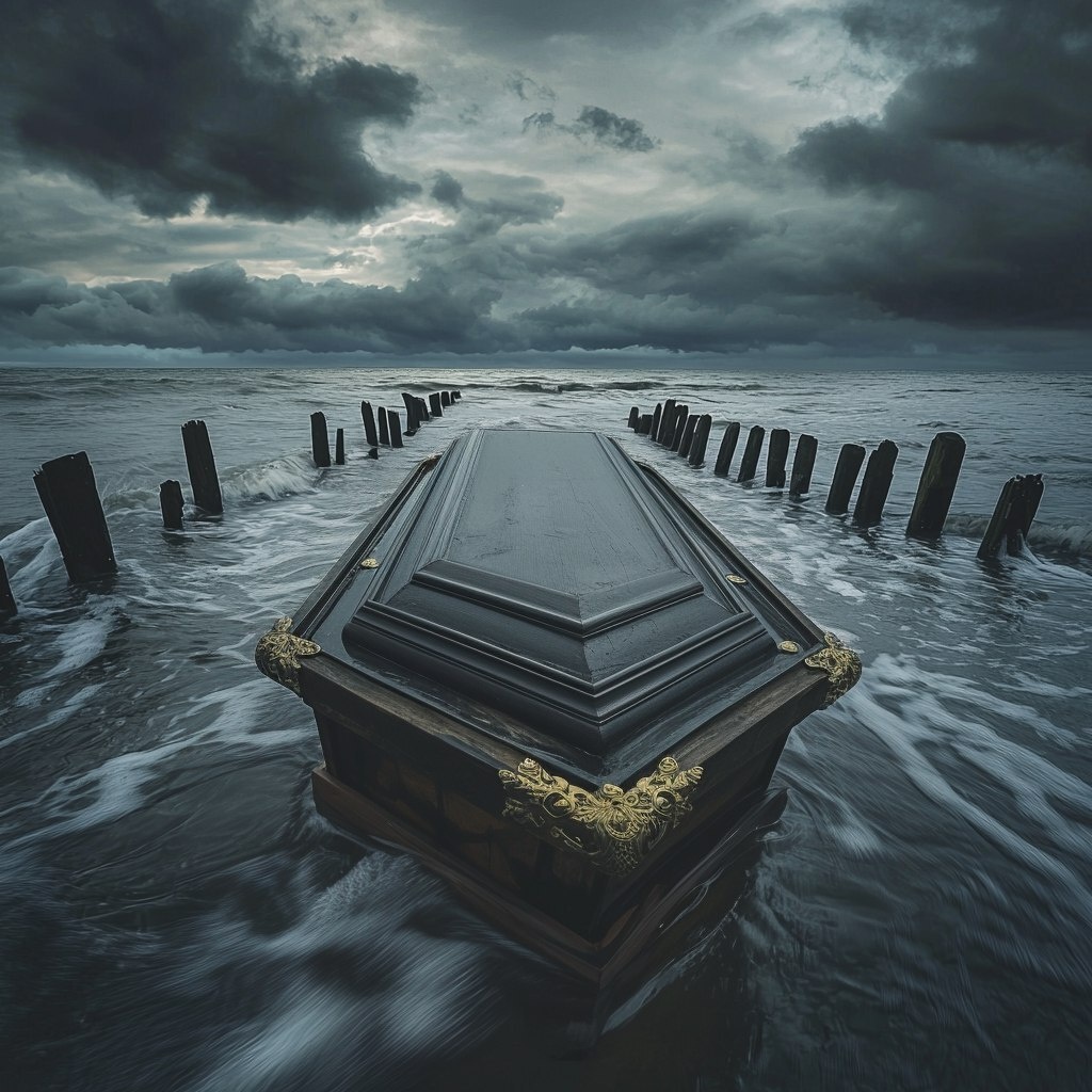 Создано на основе запроса: A traditional hexagonal wooden coffin with a slightly tapered shape, featuring a closed lid, brass handles, and a polished oak finish, floating partially submerged in cold, dark North Sea water near wooden groynes, under an overcast sky with dramatic clouds, atmospheric and moody lighting, photorealistic details, cinematic composition, intense yet muted color grading, suitable for a German coastal crime novel cover