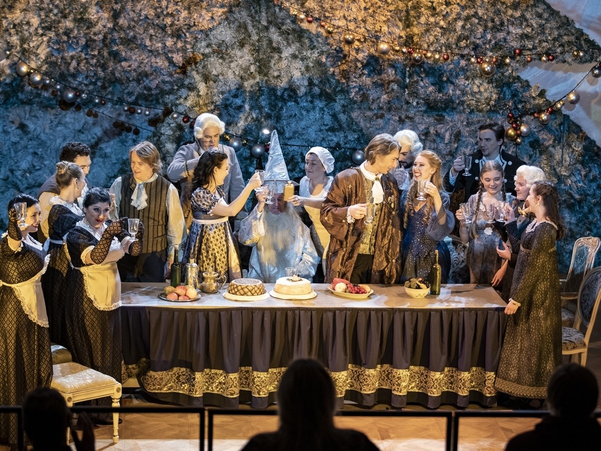 Необычно решено пространство спектакля. Малая сцена театра – открывшийся два года назад превосходный театральный зал – преображена радикально: публика сидит на сцене, а весь зал отдан во власть оперного спектакля, в центе которого – огромная рождественская елка, под которой и вокруг которой и разыгрывается домашний спектакль.