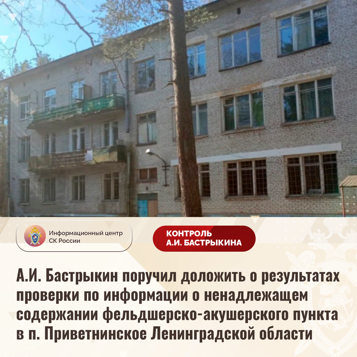 А.И. Бастрыкин поручил доложить о результатах проверки по информации о ненадлежащем содержании фельдшерско-акушерского пункта в п. Приветнинское Ленинградской области В СМИ и социальной сети сообщается, что в поселке Приветнинское Ленинградской области в помещениях фельдшерско-акушерского пункта, размещенного в ветхом здании, отсутствуют горячее водоснабжение и отопление, разрушились напольные покрытия, образовалась плесень, представляющая угрозу для здоровья пациентов. Кроме того, в расположенной по соседству комнате проживают лица, ведущие асоциальный образ жизни. Обращения в различные инстанции результатов не принесли. Меры к устранению нарушений не принимаются. В СУ СК России по Ленинградской области по данному факту организована процессуальная проверка. Председатель Следственного комитета Российской Федерации Александр Иванович Бастрыкин поручил руководителю СУ СК России по Ленинградской области Сергею Тихоновичу Сазину доложить о предварительных и окончательных результатах процес