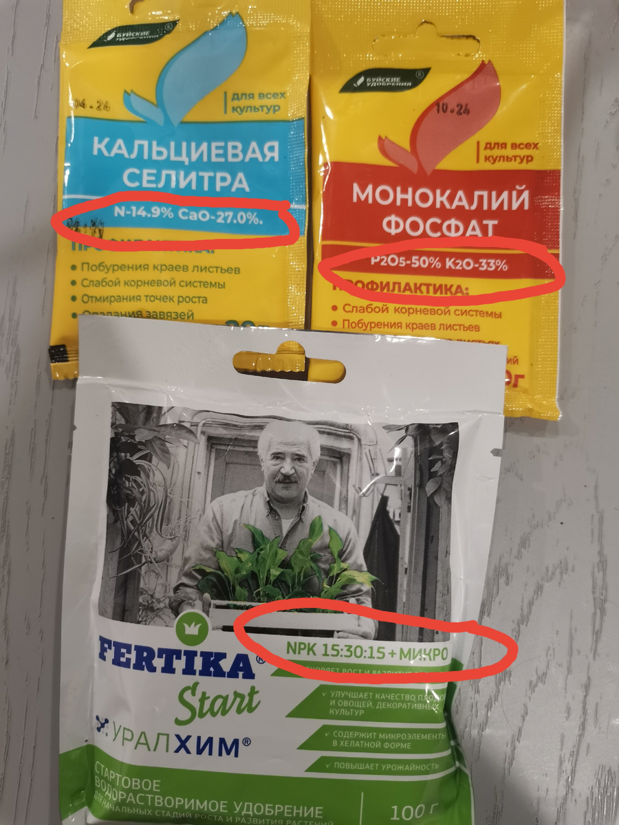 Сегодня вам расскажу по какому графику я стараюсь кормить всю свою рассаду. Для рассады покупаю три вида удобрений ✅ Комплексное (у меня Фертика старт) ✅Кальциевая селитра ✅ Монофосфат калия Рассаду начинаю выращивать с февраля - сею эустомы, петунии, пеларгонии, колеусы и далее другие цветы. Эту старшую группу начинаю кормить через неделю после пикировки. Всю рассаду начинаю подкармливать только после пикировки. Первая подкормка Комплексным минеральным удобрением с формулой 15:30:15 + микро. Подкормка по сухому грунту, как при обычном поливе - до полного смачивания земляного кома. Вторая подкормка Кальциевая селитра 1-2 г на 1 литр воды. Третья подкормка Монофосфат калия 1-2 г на 1 литр воды. Интервал между кормлением: 7-10 дней. Цветочную рассаду у меня получается подкормить большее количество раз, она и растёт у меня с февраля, а вот овощную получится подкормить только 4-5 раз, редко 6. Зависит от даты высадки и других обстоятельств. Например, перцы я пикировала