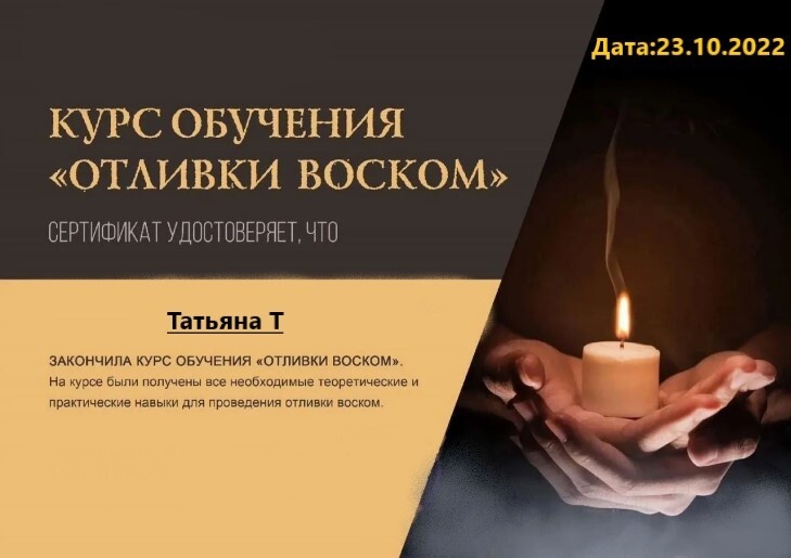 Я много лет уже занимаюсь отливками воском. Сначала я училась у женщины из соседнего поселка, ездила к ней и мы много разговаривали на эту тему, она передавала и знания и делилась историями... Естественно никакого документа для подтверждения она выдать не могла, за неимением!)))
