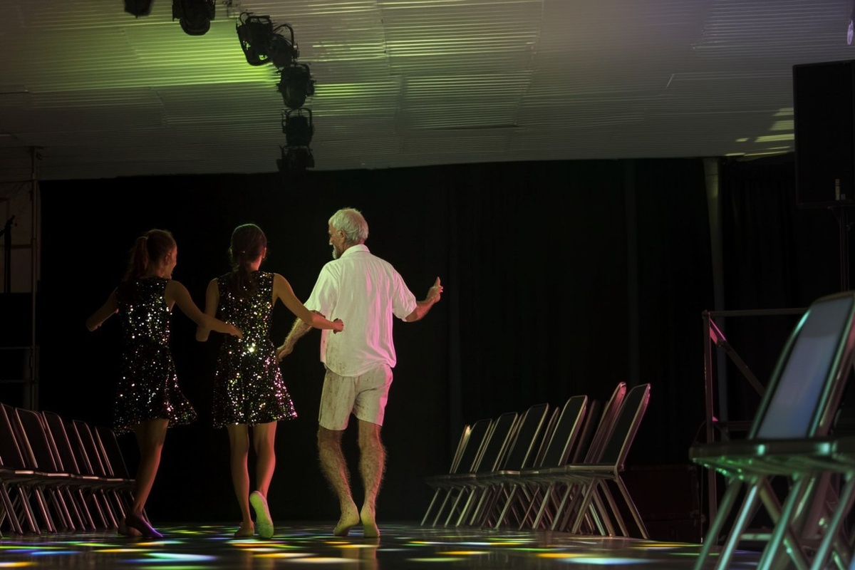 Создано на основе запроса: same space, two girls on the stage with a glitter dress are dancing with an old man with a white sweaty shirt .