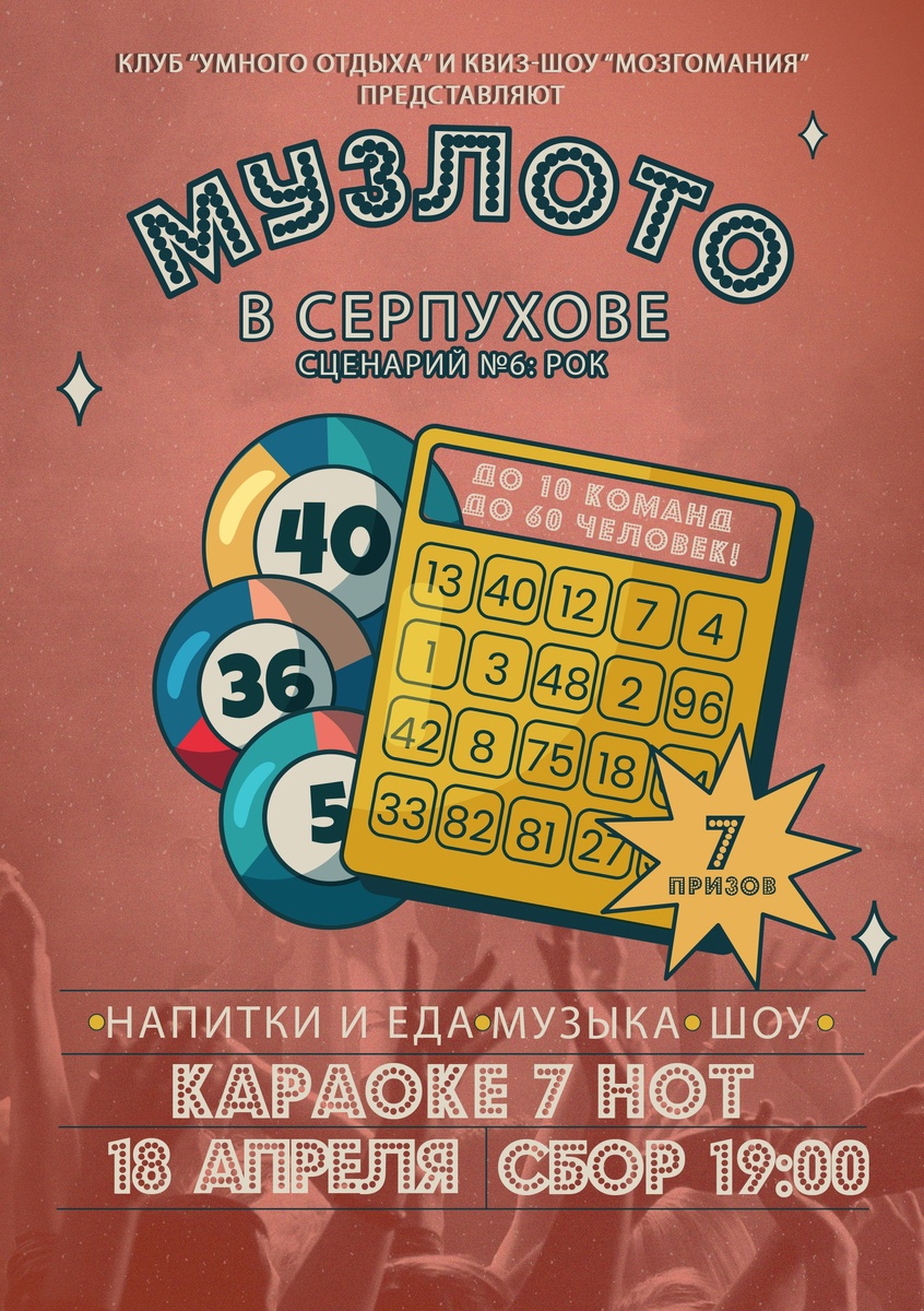 ✨ Музыкальное Лото в Серпухове Прямо сейчас открыта регистрация на шестой сценарий "РОК". Что вас ждёт: • Любимые караоке-хиты • Азартная игра в бинго • Крутые призы • Весёлая компания • Море позитива Как это работает: Получаете два бланка, индивидуальны и командный Вы выбираете какую цифру мы откроем Вычёркиваете угаданные хиты Кричите “БИНГО” и выигрывайте призы! 📆 18.04.2025 🕛 19:00 🏢 Караоке-клуб "7 НОТ" 📍 г. Серпухов, ул. Оборонная, д.22 💰 Цена: 500 ₽ 🔗 Оставить заявку: https://vk.cc/cDoUwT #МузыкальноеЛотоСерпухов #МУЗЛОТО #КлубУмногоОтдыха