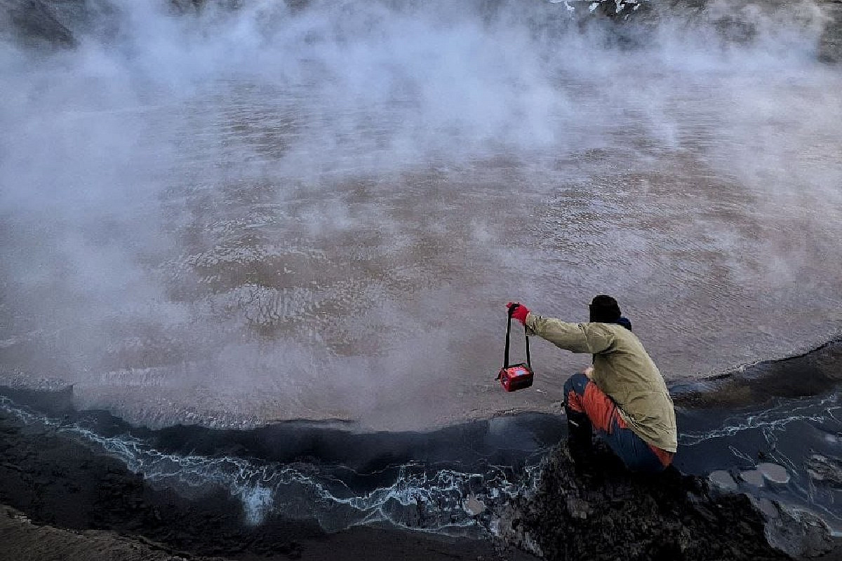 бурлит настоящий кипящий котёл. Особый интерес исследователей вызвала голубая плёнка на поверхности воды, вероятно состоящая из серы и её соединений