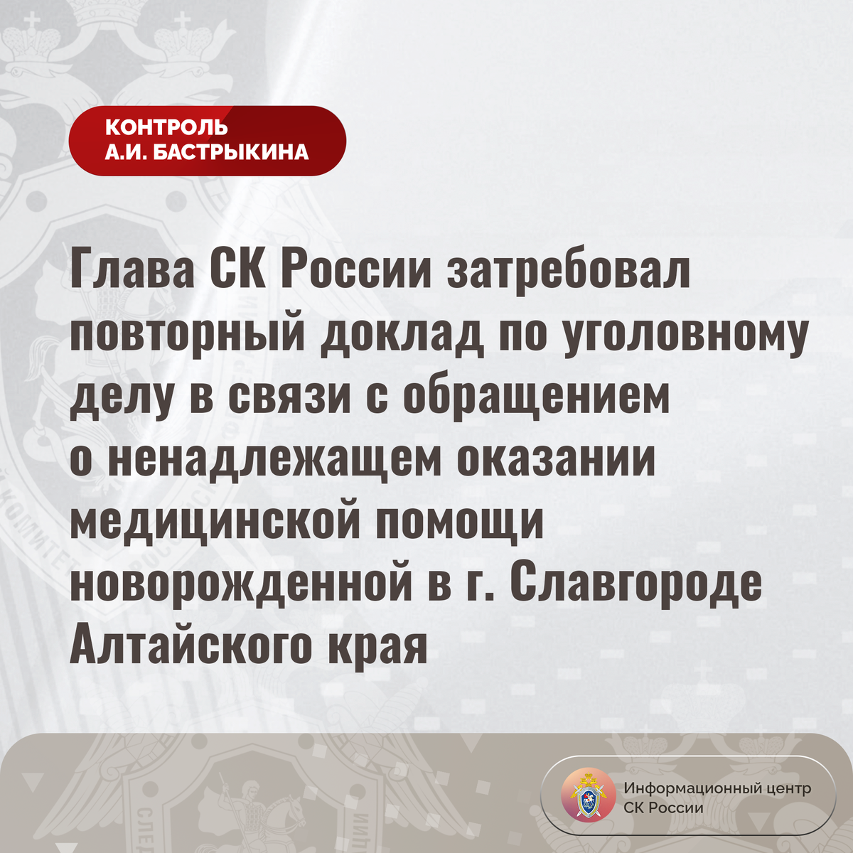 Глава СК России затребовал повторный доклад по уголовному делу в связи с обращением о ненадлежащем оказании медицинской помощи новорожденной в г. Славгороде Алтайского края В Информационный центр СК России поступило обращение о несогласии с ходом установления обстоятельств смерти новорожденной в результате ненадлежащего оказания ей медицинской помощи. В апреле прошлого года в городе Славгороде Алтайского края девочка была госпитализирована с высокой температурой, однако, несмотря на принятые меры, скончалась. Мать ребенка полагает, что это произошло из-за неверно выбранной тактики лечения. Отмечается затяжной характер расследования. До настоящего времени виновные к ответственности не привлечены. Ранее А.И. Бастрыкин ставил указанную ситуацию на контроль в центральном аппарате ведомства. В СУ СК России по Алтайскому краю расследуется уголовное дело. Председатель Следственного комитета Российской Федерации Александр Иванович Бастрыкин затребовал у руководителя СУ СК России по Алтайскому