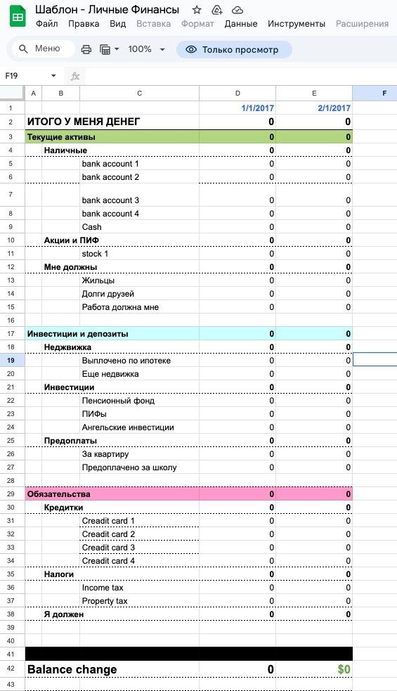 Как считать деньги Деньги любят счет. Но подсчет каждой траты - это пиздец как утомительно. С каждой тратой ты задумываешься, а на то ли я трачу деньги вообще? Создает такое мышление, когда надо сэкономить. Как ужаться. Нахер такое. Однажды я стырил шаблон и идею как считает деньги у Андрея Дороничева. Мне очень понравилось. Суть проста - нужно каждый промежуток времени считать сколько у тебя денег сейчас, где сколько чего вложено и считать суммарную капитализацию всего что у тебя есть: Цель: получить точный снимок всего денежного что у тебя сейчас есть 1. Берешь остататки со всех банков, кредиток, вложений и тд 2. Если есть какие-то предоплаченное (как например школа на год вперед) - списываешь с этого "счета" сколько там за месяц списалось 3. Погашения по ипотеке каждый месяц плюсуются в House principal. Также ремонты и тд (то что можно плюсануть) пишу в house improvements 4. Когда получились суммы, сверху видишь - сколько у тебя реальный баланс (с учетом всех активов и долгов